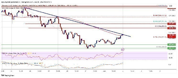 The lowest is formed at $103,200, and the price consolidates the losses. It surpassed the $104,200 level and surpassed the 23.6% FIB retracement level from the recent $110,500 swing height to a low of $103,200.